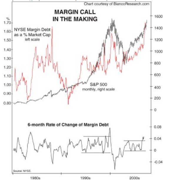 Один из исторических способов, которыми инвесторы фондового рынка демонстрируют уверенность в направлении движения цен, — это использование кредитного плеча или участие на рынке с заемными деньгами. Еще один способ выразиться в этом — «торговля с маржой». Еще в 1929 году это стало падением для многих, кто рассматривал рынок как быстрый способ разбогатеть. Заголовок газеты Boston Daily Globe от 29 октября 1929 года: «Закрытие маржинальных счетов приводит к краху акций …». Тем не менее, вы можете найти примеры и из более поздней истории. Вот диаграмма и комментарии из нашего финансового прогноза волн Эллиотта за июнь 2007 года: