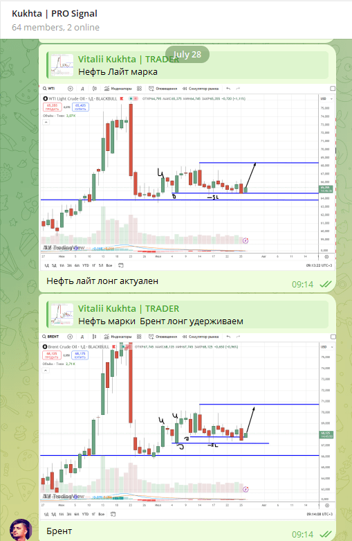 — Торговые сигналы предоставляются по авторской торговой стратегии «Модельный трейдинг » на базе анализа рынка (авторских торговых паттернов и уровней). Мы сообщаем Вам цену открытия торговой позиции (покупка/продажа), цели (тейк профит) и стоп лосс по каждому торговому сигналу и рекомендованный риск на сделку. Мы сопровождаем сигналы и, в случае необходимости, корректируем их.