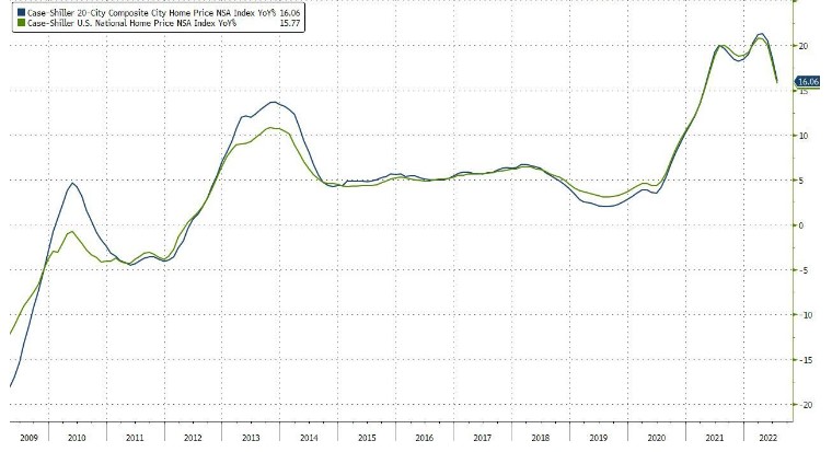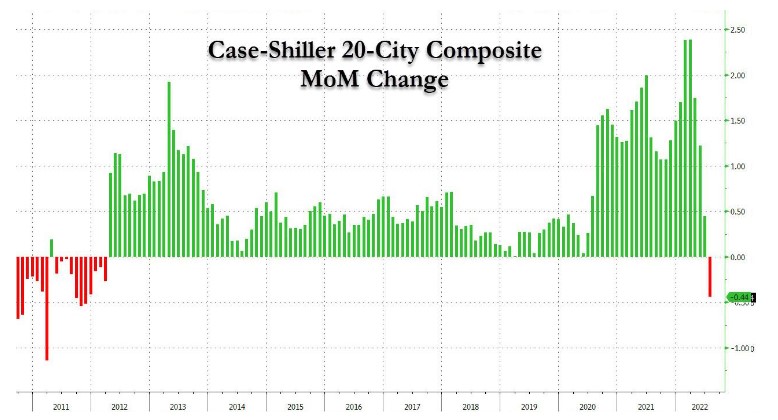 Аналитики ожидали, что рост цен на жилье Case-Shiller продолжит свое скромное замедление в августе (последние доступные данные в этом сильно запаздывающем и сглаженном наборе данных), но результат был сногсшибательным: индекс 20-City Composite упал на 0,44% м/м, что намного ниже ожидаемого увеличения на 0,20% и резкое снижение по сравнению с пересмотренным в сторону понижения увеличением на 0,19% в июле; что еще более важно, это было первое последовательное падение цен на жилье, отслеженное Case-Shiller, с марта 2012 года, или за десять с половиной лет.