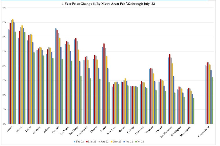 Комментарии подтвердили, что настроение унылое и с каждым днем становится все более скверным: «Хотя цены на жилье в США остаются значительно выше уровня прошлого года, июльской отчет отражает сильное замедление», — говорит Крейг Дж. Лаззара, управляющий директор S&P DJI. «Например, в то время как национальный композитный индекс вырос на 15,8% за 12 месяцев, закончившихся в июле 2022 года, рост его цен в годовом исчислении в июне составил 18,1%. Разница в -2,3% между этими двумя месячными темпами роста является самым большим замедлением в истории индекса. Аналогичные закономерности мы наблюдали в нашем сводном рейтинге по 10 городам (рост на 14,9% в июле по сравнению с 17,4% в июне) и нашем композитном отчете по 20 городам (рост на 16,1% в июле по сравнению с 18,7% в июне). В месячном исчислении все три композита снизились в июле». «Тема высоких, но снижающихся цен отразилась во всех 20 городах. Изменение цен в годовом исчислении в июле было положительным для каждого из 20 городов со средним приростом 15,0%, но в каждом случае прирост в июле был меньше, чем в июне. Цены снижались в 12 городах из месяца в месяц. «Тампа» (+31,8%) с небольшим отрывом от «Майами» (+31,7%) остается на вершине турнирной таблицы пятый месяц подряд, а «Даллас» (+24,7%) удерживает третье место. Как и в последние несколько месяцев, наибольший рост цен был на юго-востоке (+27,5%) и юге (+26,9%).